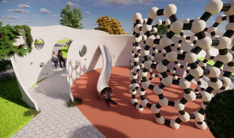 This exhibit plays with perspective and illustrates the scale of the tiniest and largest structures in the universe. The structures and properties of all types of matter will be displayed along the main walls of the exhibit area with displays placed in nearby open spaces.